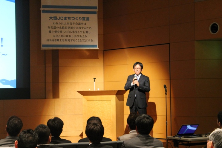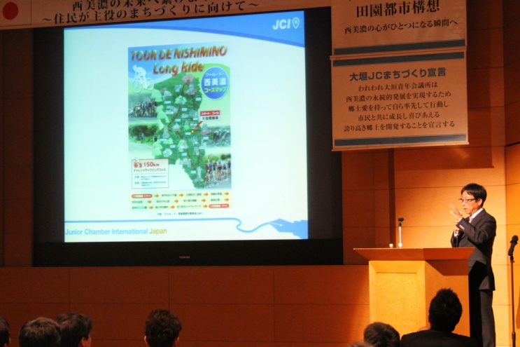 11月1日(金)ソフトピアジャパンにて11月度例会を開催いたしました。「西美濃の未来へ繋げよう!〜住民が主役のまちづくりに向けて〜」をテーマとして掲げ、まちづくりに精通した原啓祐氏にご講演いただきました。ご講演の中の、自転車というモノを通じてご自身が感じられた人との出会いのありがたさ、コミュニケーションの大切さ、困難にぶつかったときの対処、そしてまちづくりの楽しさと想いなどのお話は、まさに今の我々に大きなヒントと勇気を与えてくれる、琴線に触れた内容だったのではないでしょうか。また、会の前半では、西美濃協調デザインの策定をした経緯から、これまでの最重点事業の取り組みを紹介させていただき、後半では2014年度理事長候補者高木健一君より未来への構想を発表致しました。この例会によりご参加いただいた行政、諸団体、一般の方々に、大垣青年会議所を理解していただき、未来の活動への足掛かりとなる良い機会になったと感じております。