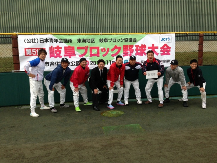 11月2日(土)郡上市の地にて第51回岐阜ブロック野球大会が行われました。今年はメンバーに恵まれ、毎月多数のメンバーが参加してくれたので、3月より紅白試合と交流試合を毎月行い、本大会へ望みました。当日は朝6時大垣出発というハンディがありましたが、第1回戦は関JCとの対戦でした。小ナベこと渡邊君が力投し、打っては14点と容赦ない攻撃で、第1回戦を見事勝利。第2回戦は宿敵岐阜JC戦。この時の為に1年練習してきたと言ってもいいくらい、メンバー全員気合が入り、先発を永年肩を温めてきた設田君に託し、臨みました。1回に1点を先取し、設田が力投するもエラーが絡んでしまい、1×3で残念ながら2回戦敗戦。今年はサッカー部がブロック大会で優勝したので、野球部もと意気込んでおりましたが、残念な結果となりました。しかしながら、期待の新人も入会し、来年が楽しみになりましたので、ぜひリベンジをしてもらいたいです。