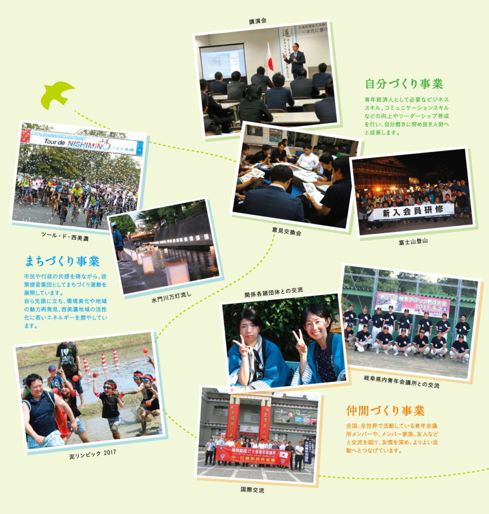 大垣青年会議所は設立73年目を迎え、西美濃地域在住の20歳から40歳までの青年経済人で構成されており、「修練」「奉仕」「友情」を基本として会員相互で啓発と交流をはかり、真の世界平和を見据えて西美濃地域の発展のために活動している青年団体です。そしてこの西美濃のみならず、我々には日本中に約3万人の同じ志を持ち活動している青年会議所メンバー、世界中の青年会議所とのネットワークがあり、広い視野で活動しております。