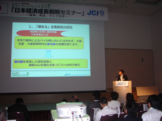 次に末永義典委員長をはじめとする林 秀昭君、林 裕人君、三輪 仁史君が出向されておりますアカデミー委員会より事業報告が行われました。末永委員長が堂々とした姿で発表されているされているのが、印象に残りました。私たち広報渉外委員会も多少ではありますが、大垣、関ヶ原にて行われた事業に関わらせて頂きましたので、末永委員長をはじめとする出向メンバーががんばっている姿を何回も見ているだけに発表後の拍手に力が入ってしまいました。