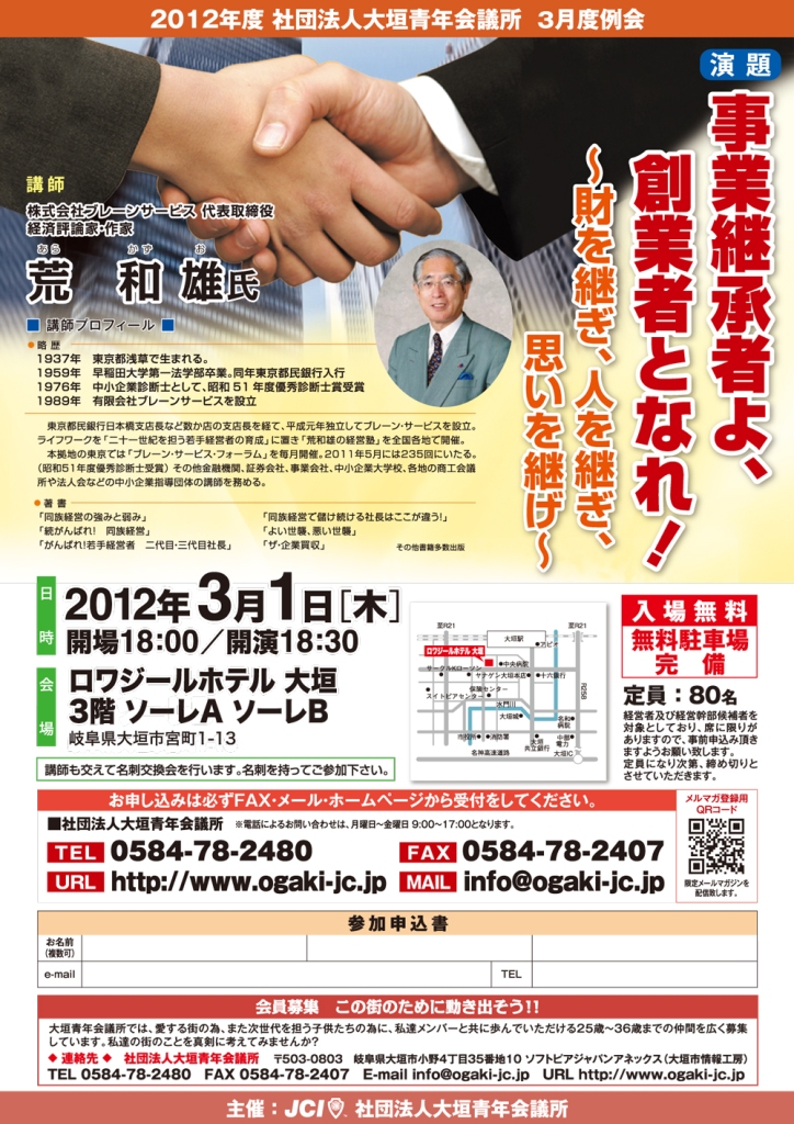 2012年3月1日(木) 株式会社ブレーンサービス 代表取締役 荒 和雄 氏 を迎え、「事業継承者よ、創業者となれ! 〜「財を継ぎ、人を継ぎ、思いを継げ」 〜」 を 演題とし、3月度のオープン例会を行います。
